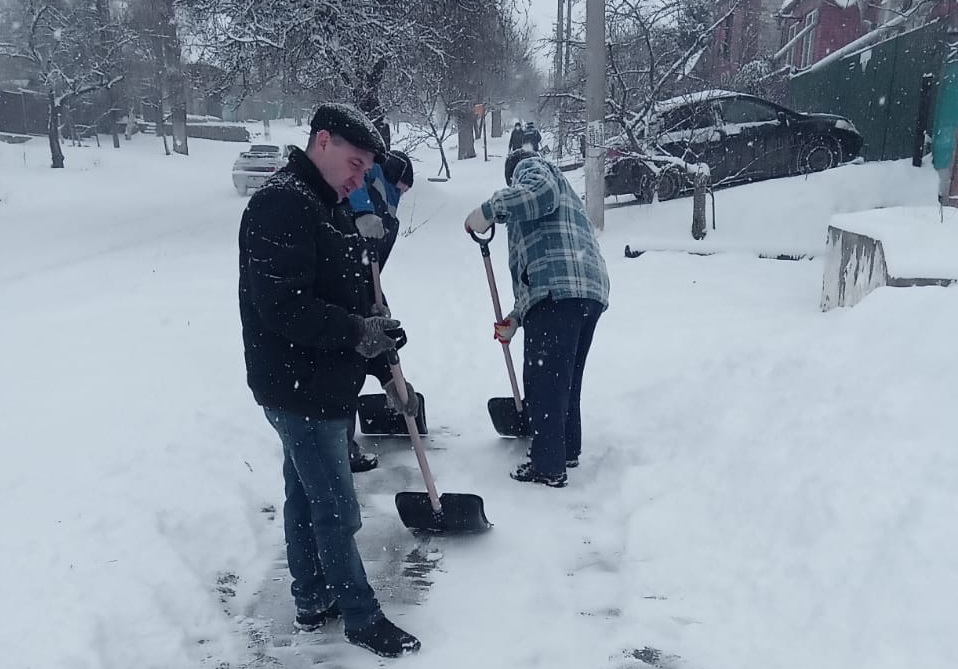 Дворники управляющих компаний расчищают снег во дворах. На помощь коммунальным службам вышли сотрудники городской администрации и муниципальных учреждений. Они расчищают от снега тротуары и общественные территории.